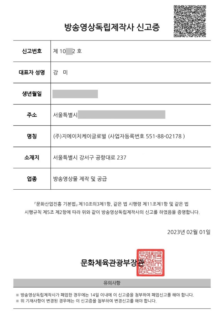 ㈜GHK글로벌은 방송영상독립제작신고필증을 부여받았으며,